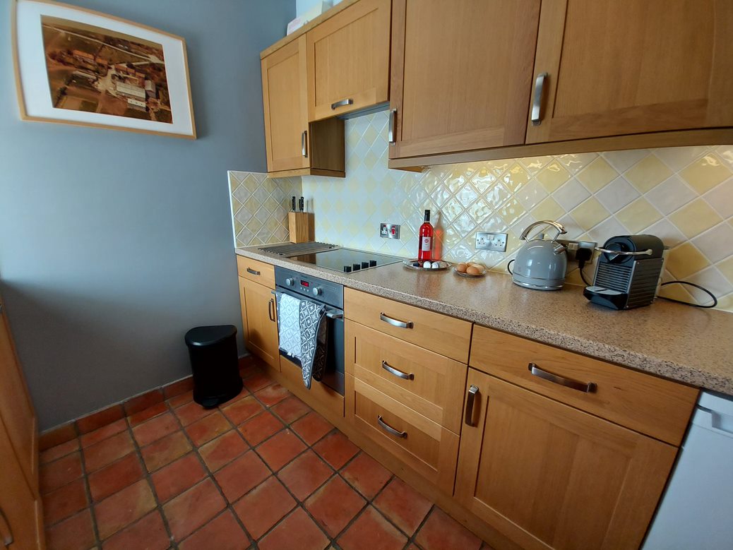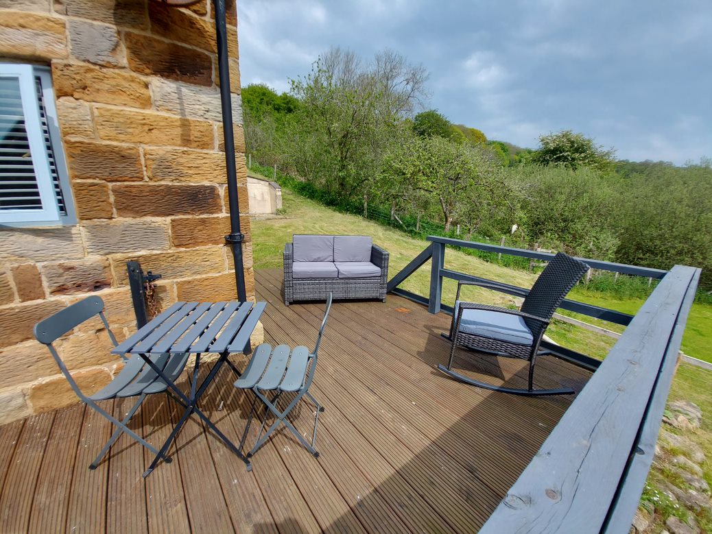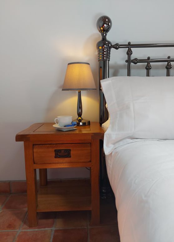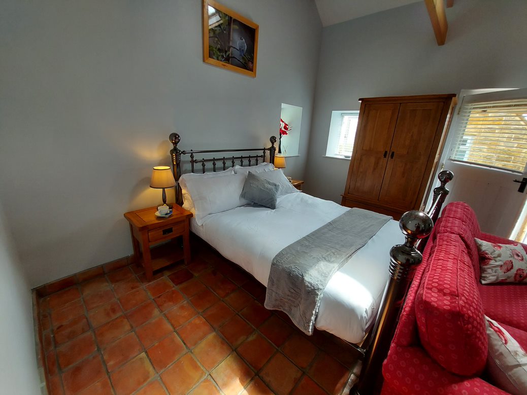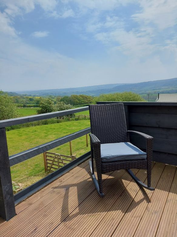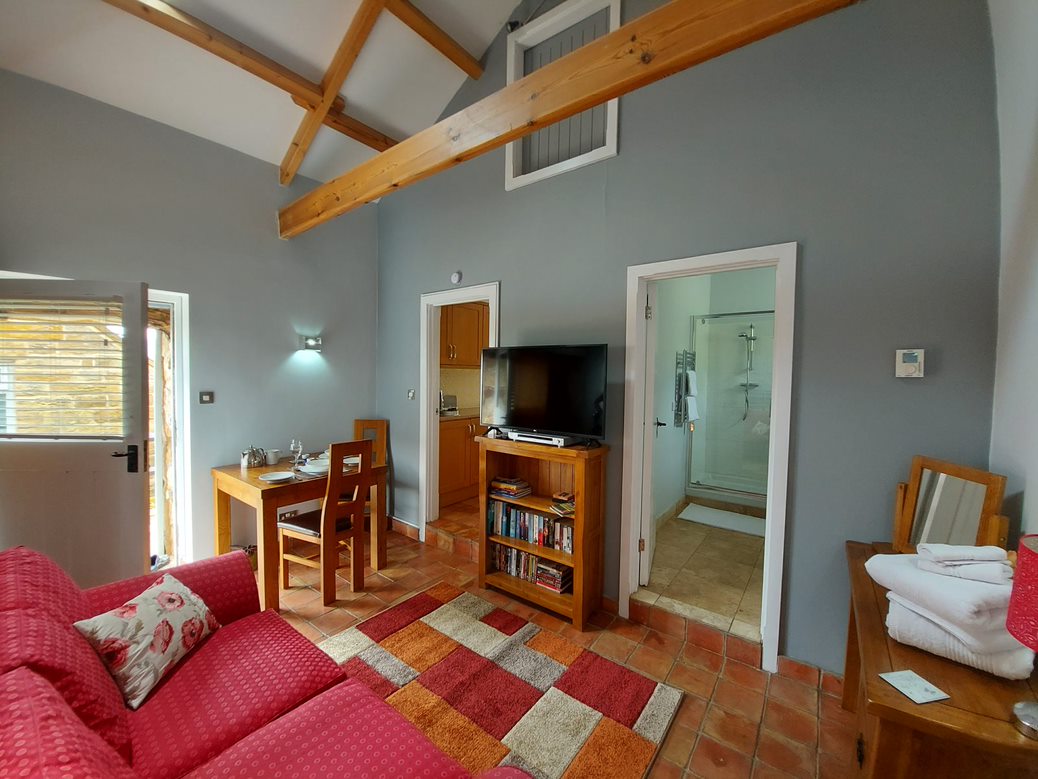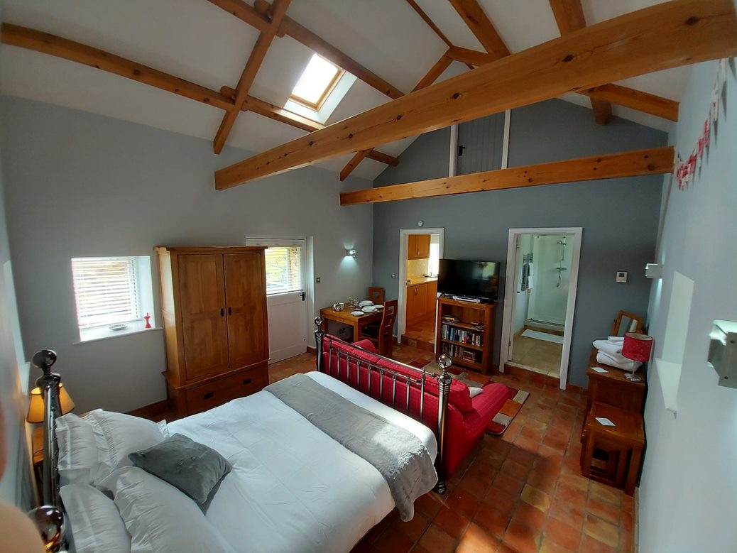 She has a cosy open plan living and sleeping area, with king size bed, oak wardrobe, bedside cupboards and book shelves, table and chairs, sofa and desk. A separate well-equipped kitchen with washing machine, dishwasher, oven, fridge, microwave and Nespresso coffee machine with views across the traditional sunny outdoor deck with outdoor sofa, rocking chair and table/chairs with view over the rolling valley.